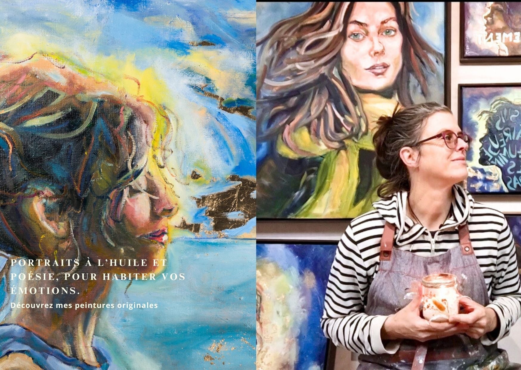 Bienvenue dans l’Atelier L’Image Écrite, en Alsace, près de Mulhouse. Ici, je peins des portraits de femme à l’huile, accompagnés d’un poème. Vous pouvez presque sentir l’odeur de la peinture de mon atelier.