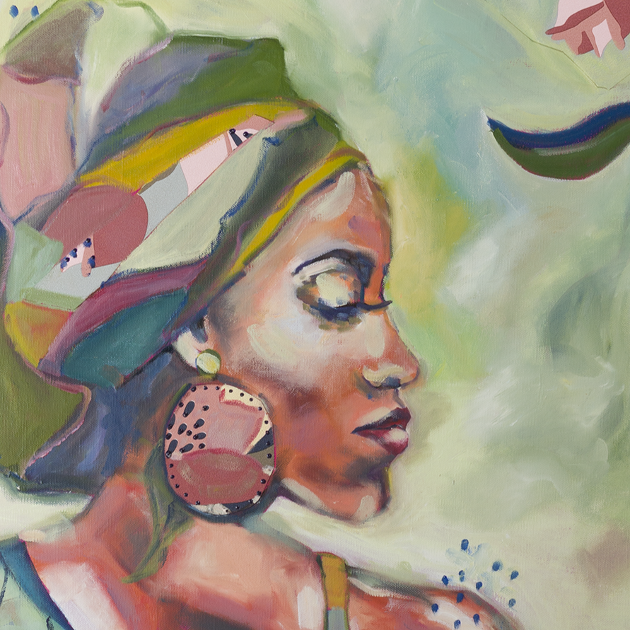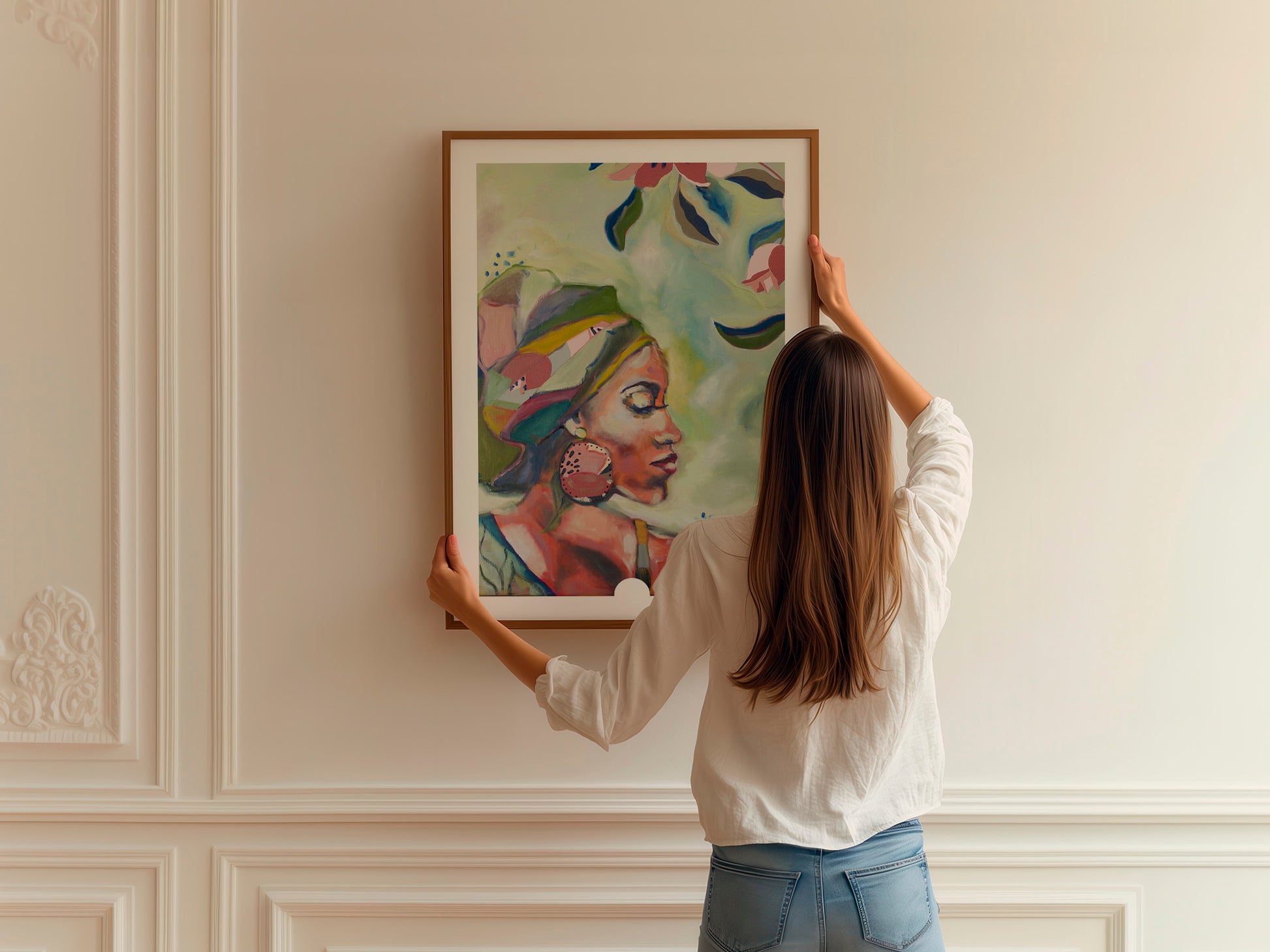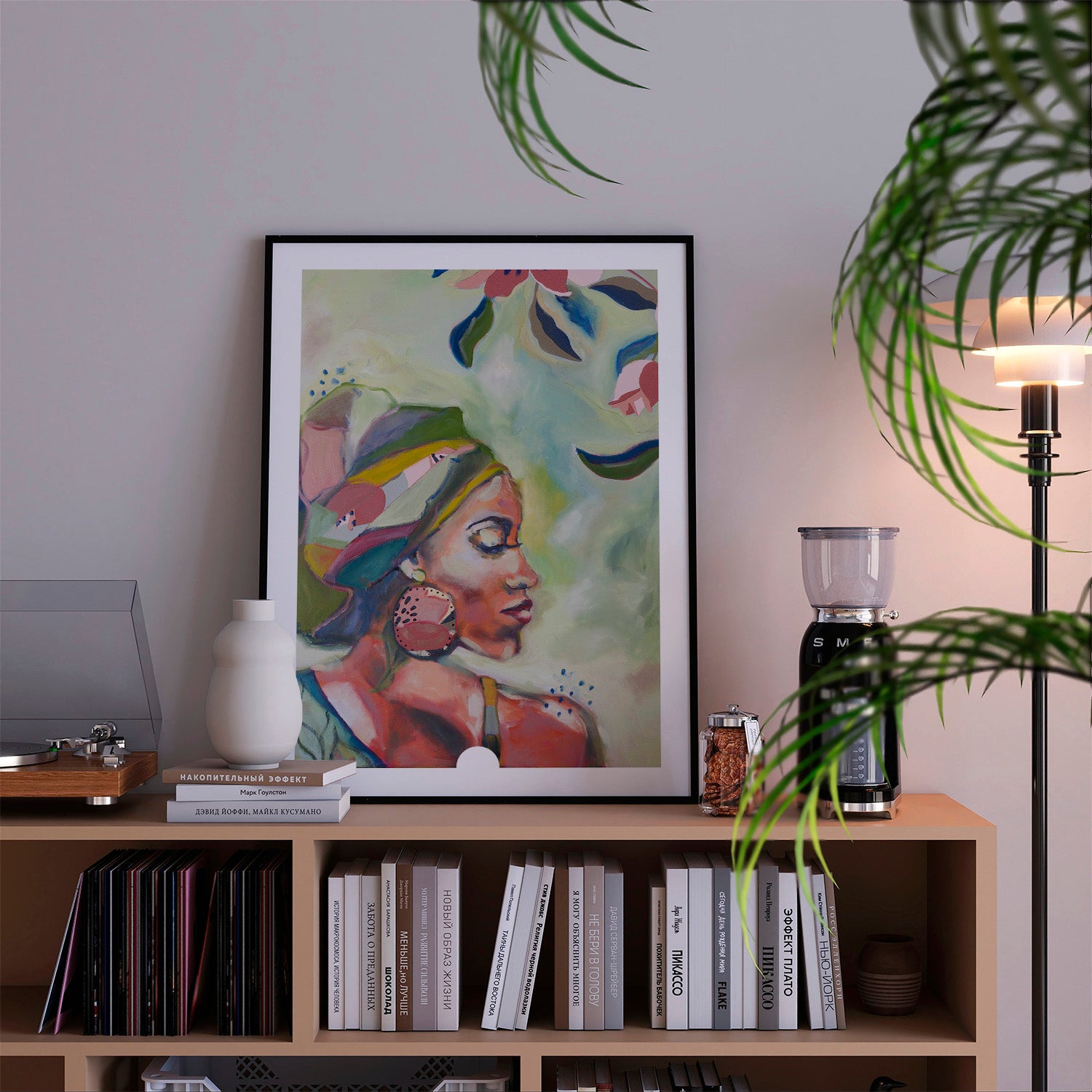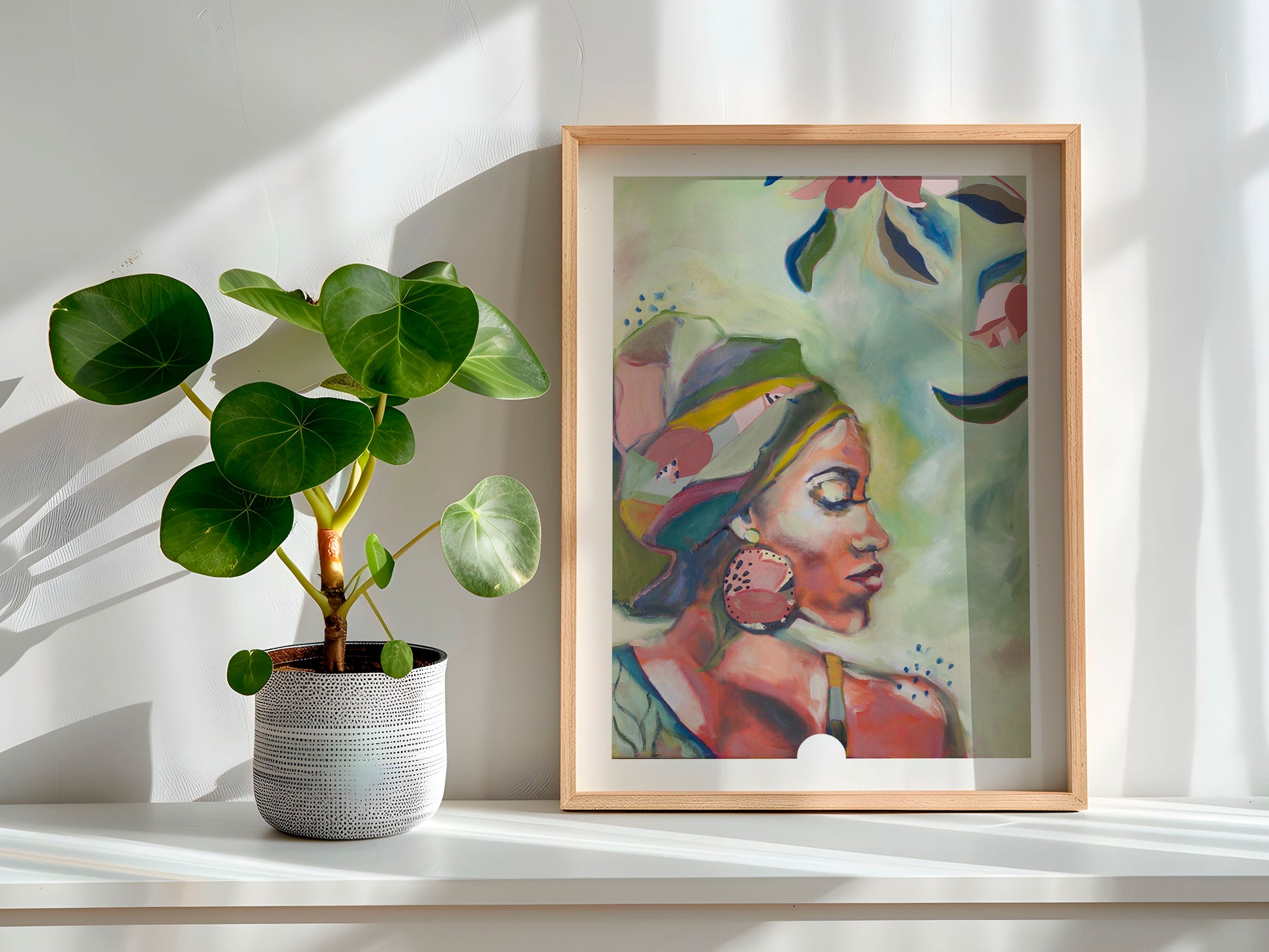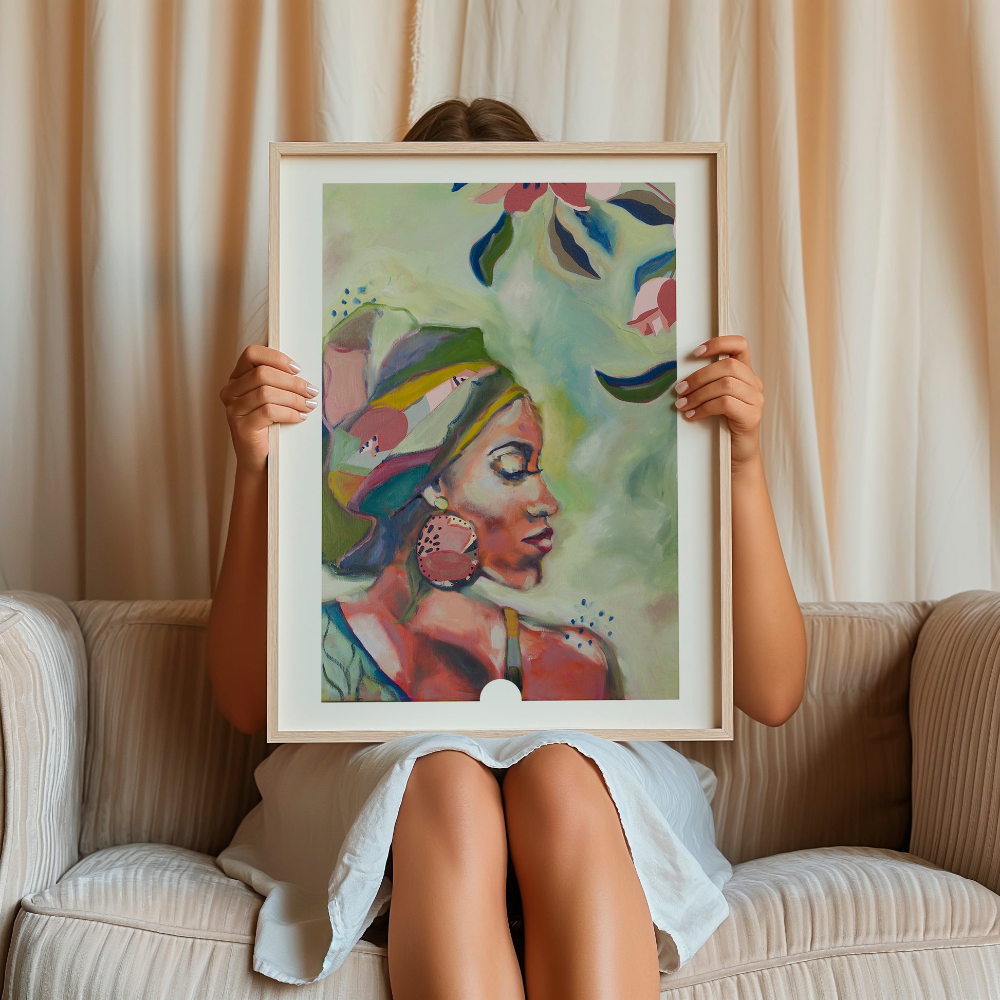 Découvrez "La Tisseuse de lien", un tirage d'art qualité musée qui capture la force et la sérénité d'une femme africaine de profil, les yeux fermés, enveloppée dans un turban. Ce tableau audacieux mêle des teintes profondes de vert, brun et rose, évoquant un décor végétal luxuriant. Une œuvre contemporaine de 2025 qui invite à la contemplation et célèbre la beauté et la connexion féminine. Parfait pour sublimer votre intérieur avec une touche d'authenticité et de puissance.