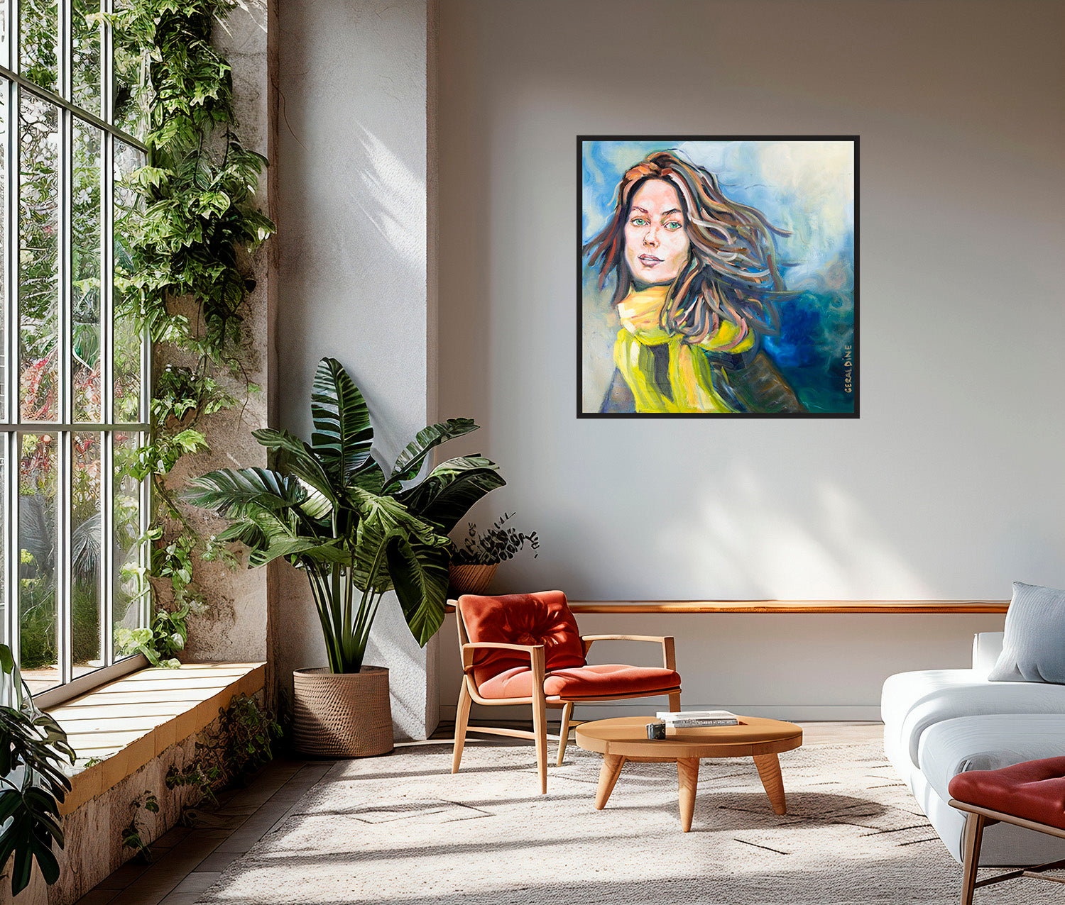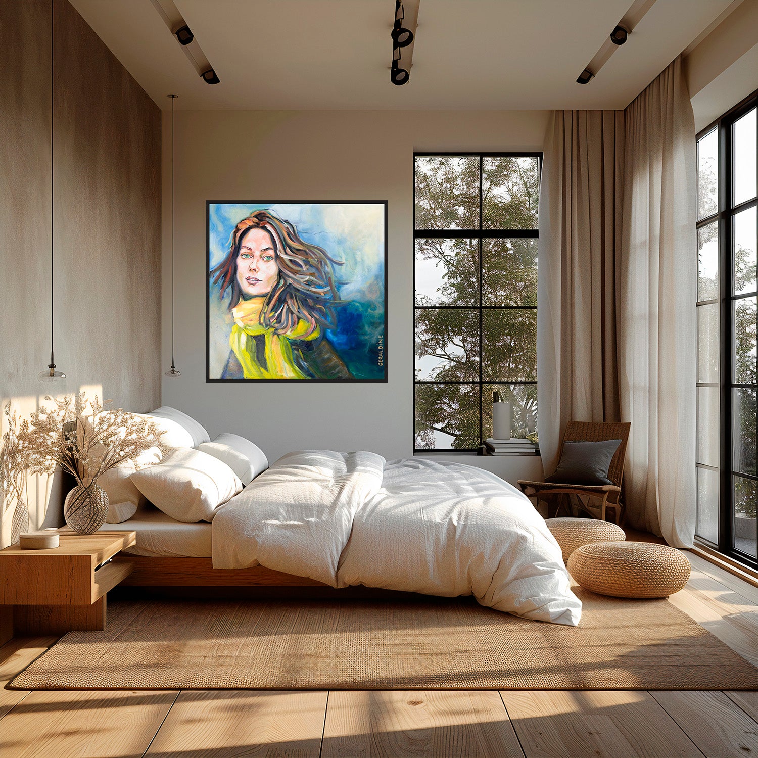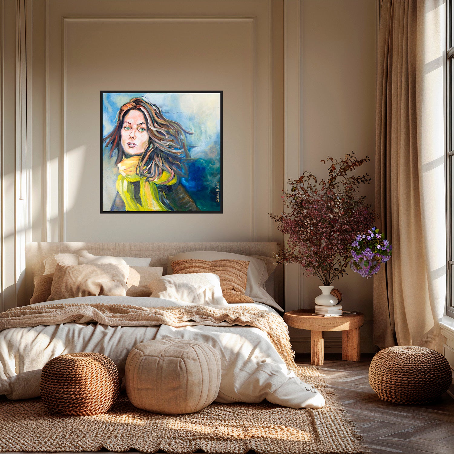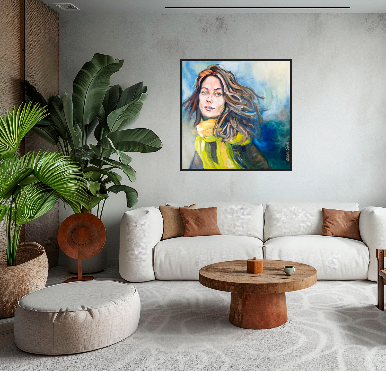 Découvrez Le mouvement, une œuvre originale et unique qui capture l'essence d'une femme dansante au gré du vent. Mesurant 100 x 100 cm, ce portrait saisissant déploie une écharpe fluide, créant un effet de mouvement fascinant qui semble presque vivant. Avec des couleurs dominantes de bleu, jaune et brun, cette peinture à l'huile et acrylique sur toile en lin évoque une harmonie vibrante tout en apportant une profondeur exceptionnelle à chaque coup de pinceau. Encadrée dans une caisse américaine en bois anthracite, cette pièce est une célébration visuelle de la liberté et de la féminité, un incontournable pour les amateurs d'art à la recherche d'une touche moderne et inspirante dans leur intérieur.