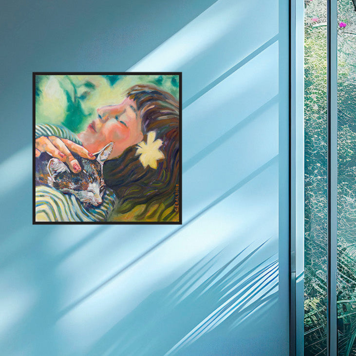 Découvrez "L'instant présent",une œuvre originale et unique qui capture la beauté éphémère de l'instant. Cette peinture à l'huile sur un support robuste de 10 mm en MDF, met en scène une femme sereine, allongée sur son canapé, plongée dans un doux moment de complicité avec son chat. Les teintes vibrantes de jaune, de violet et de turquoise dansent sur la toile, évoquant chaleur et introspection, tandis que le cadre en caisse américaine en bois anthracite apporte une touche contemporaine et élégante. Laissez-vous emporter par la tranquillité de cette pièce, un véritable hommage à la paix intérieure et à la tendresse, créée en 2024 pour enrichir votre espace de vie.