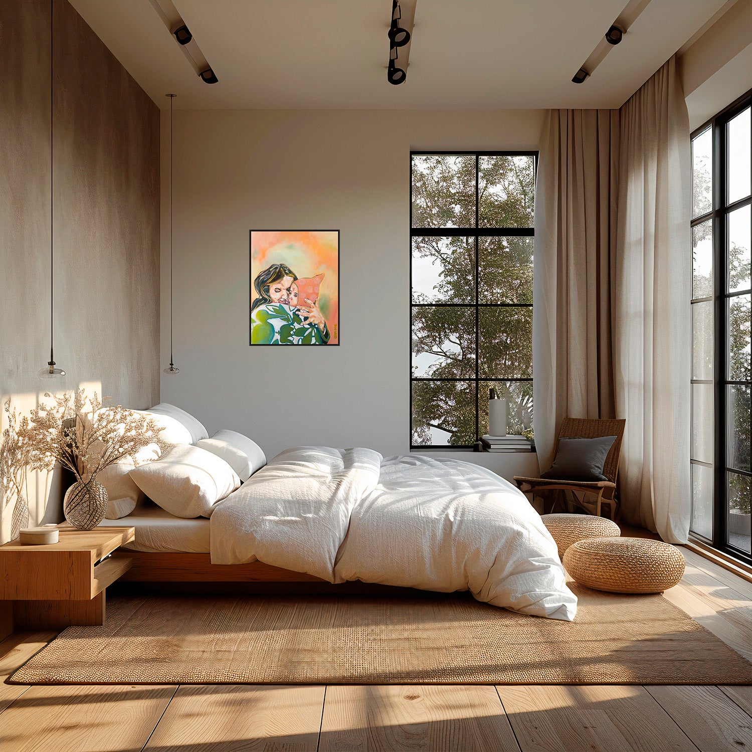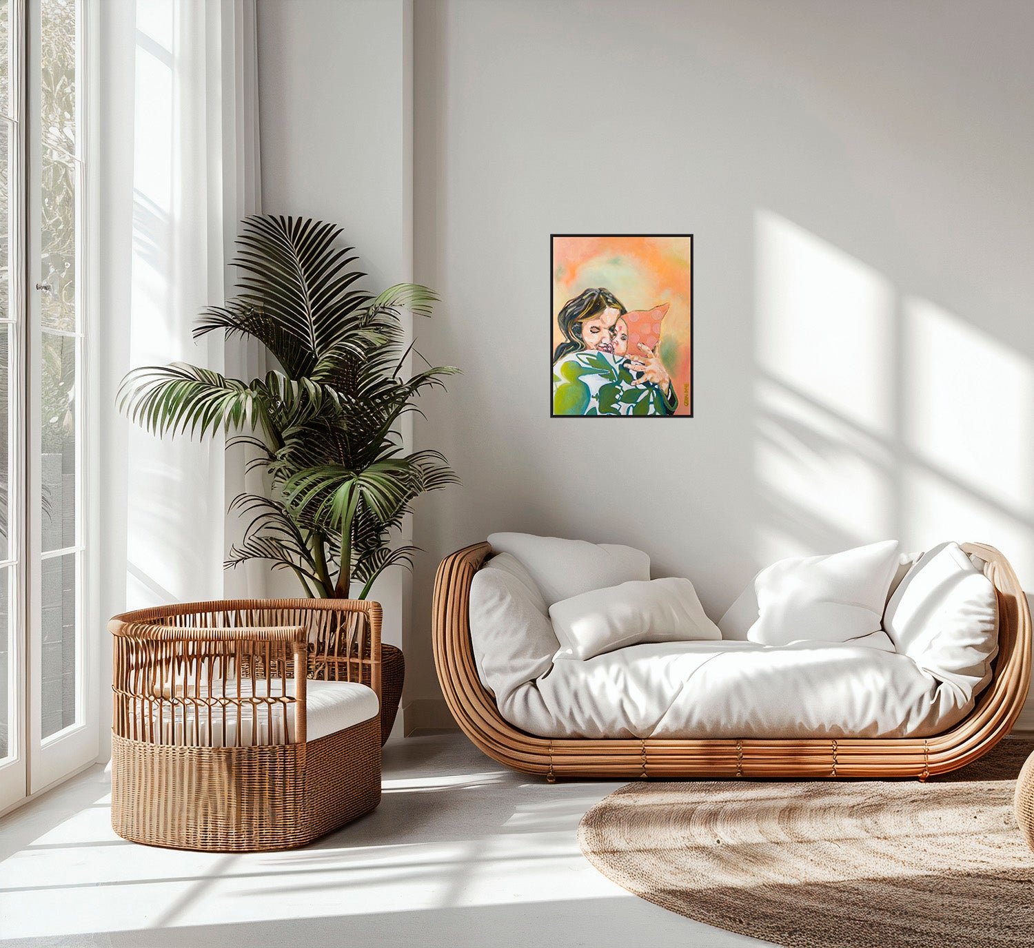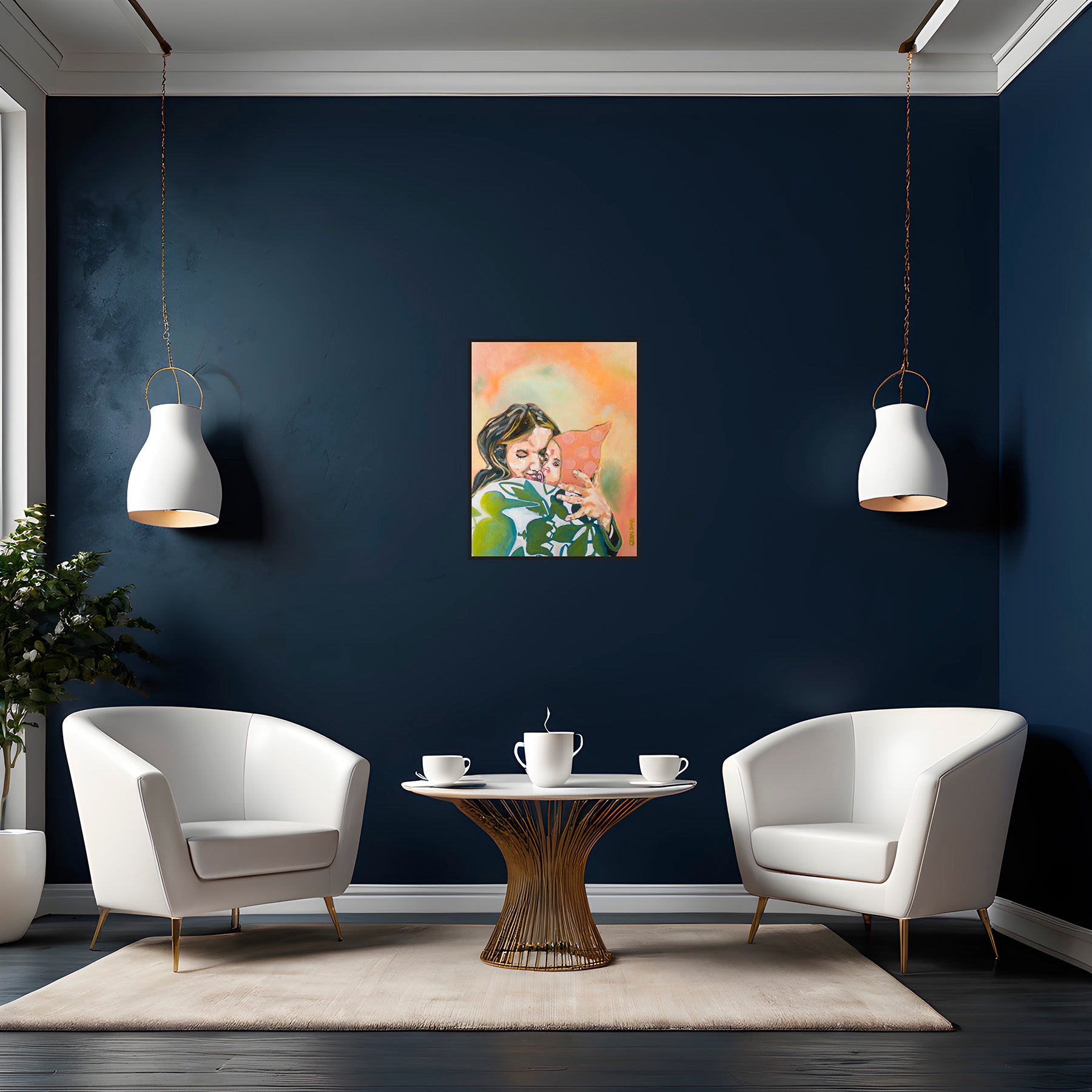 Découvrez "Un ange passe 65x50cm", un tableau unique d'une mère et son bébé dans les bras. Avec des couleurs dominantes délicates et une technique de peinture à l'huile, cette oeuvre originale inspirée par une envie de capturer un moment précieux, trouvera sa place dans votre intérieur avec son cadre élégant en caisse américaine MDF anthracite.