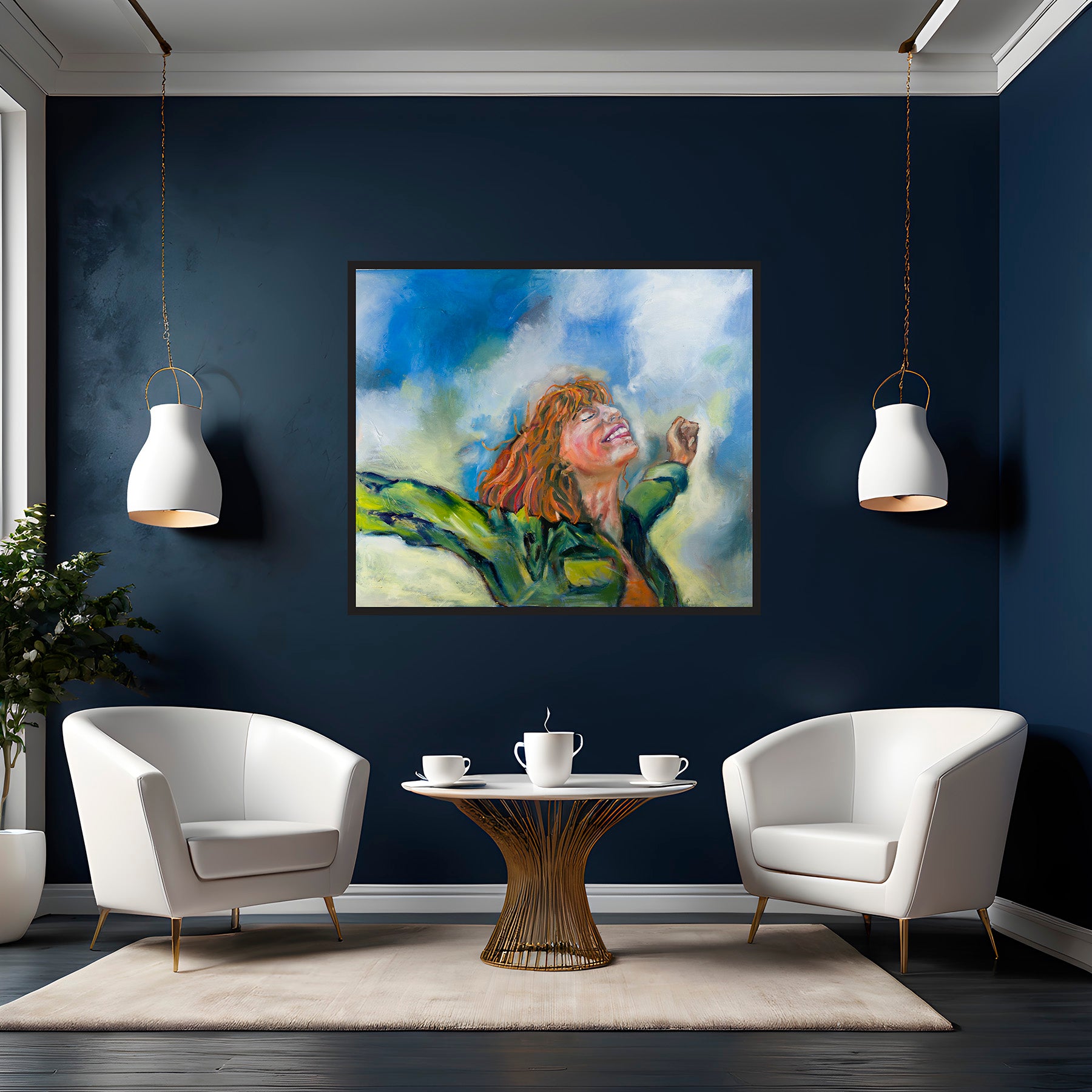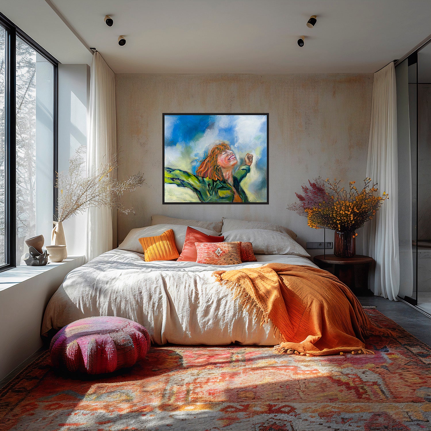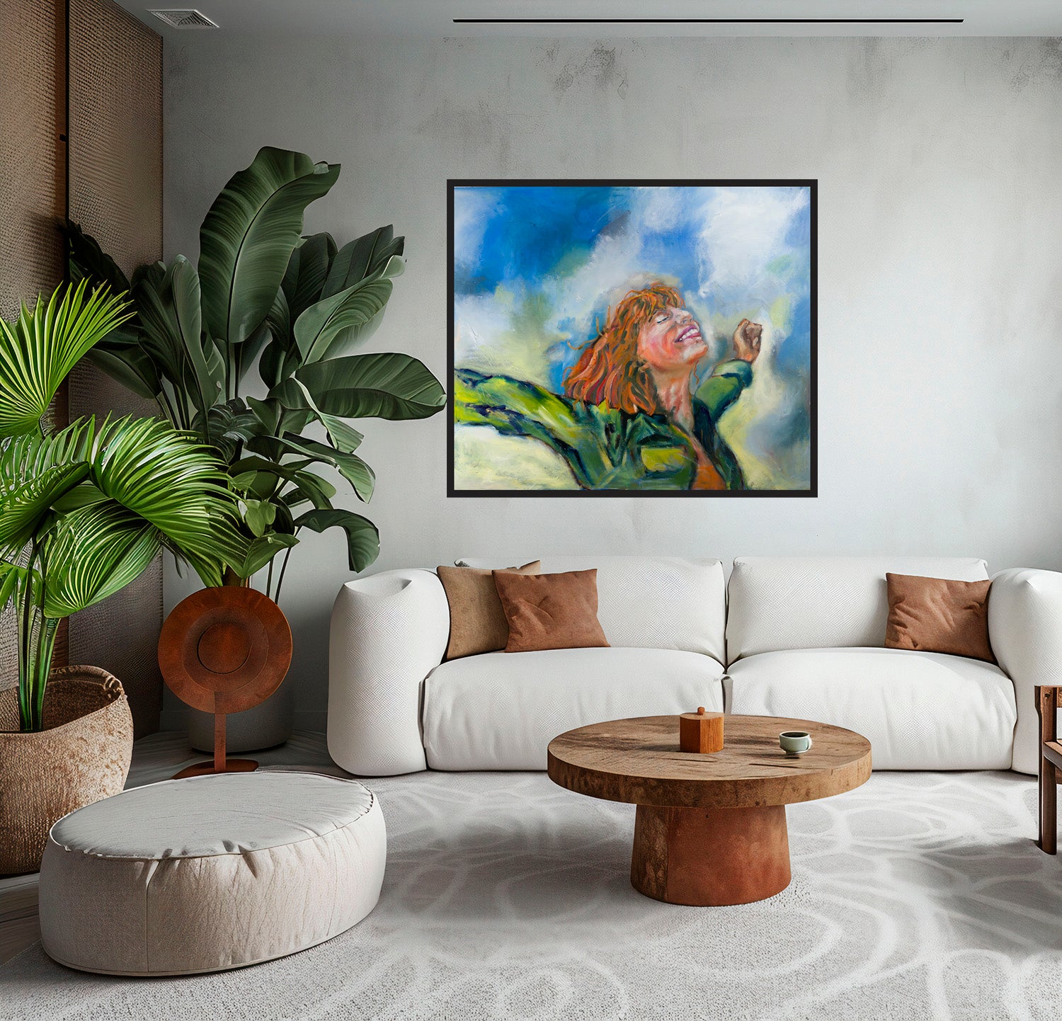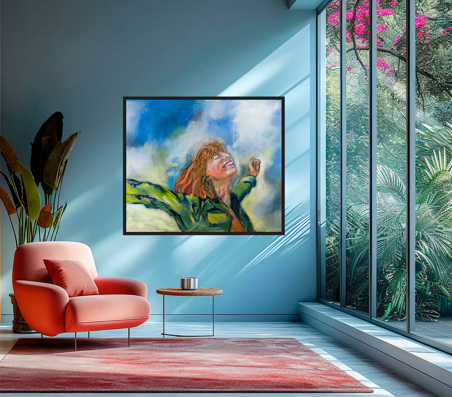 Plongez dans l’univers envoûtant de "Vivre à tire-d'aile", une œuvre originale qui transcende le quotidien pour célébrer l'authenticité. Sur une toile en lin généreusement dimensionnée (110x120), cette peinture à l'huile dévoile une femme aux bras grands ouverts, prête à s’envoler, légère comme une plume, complice du vent qui l’entoure. Les nuances de bleu, jaune et orange fusionnent harmonieusement, évoquant un ciel d’aube prometteur où chaque couleur porte une promesse de liberté et d'espoir. Établie dans un élégant cadre en bois anthracite, cette pièce unique invite à la contemplation et à l'élévation, faisant d'elle un véritable symbole de votre quête d'évasion.